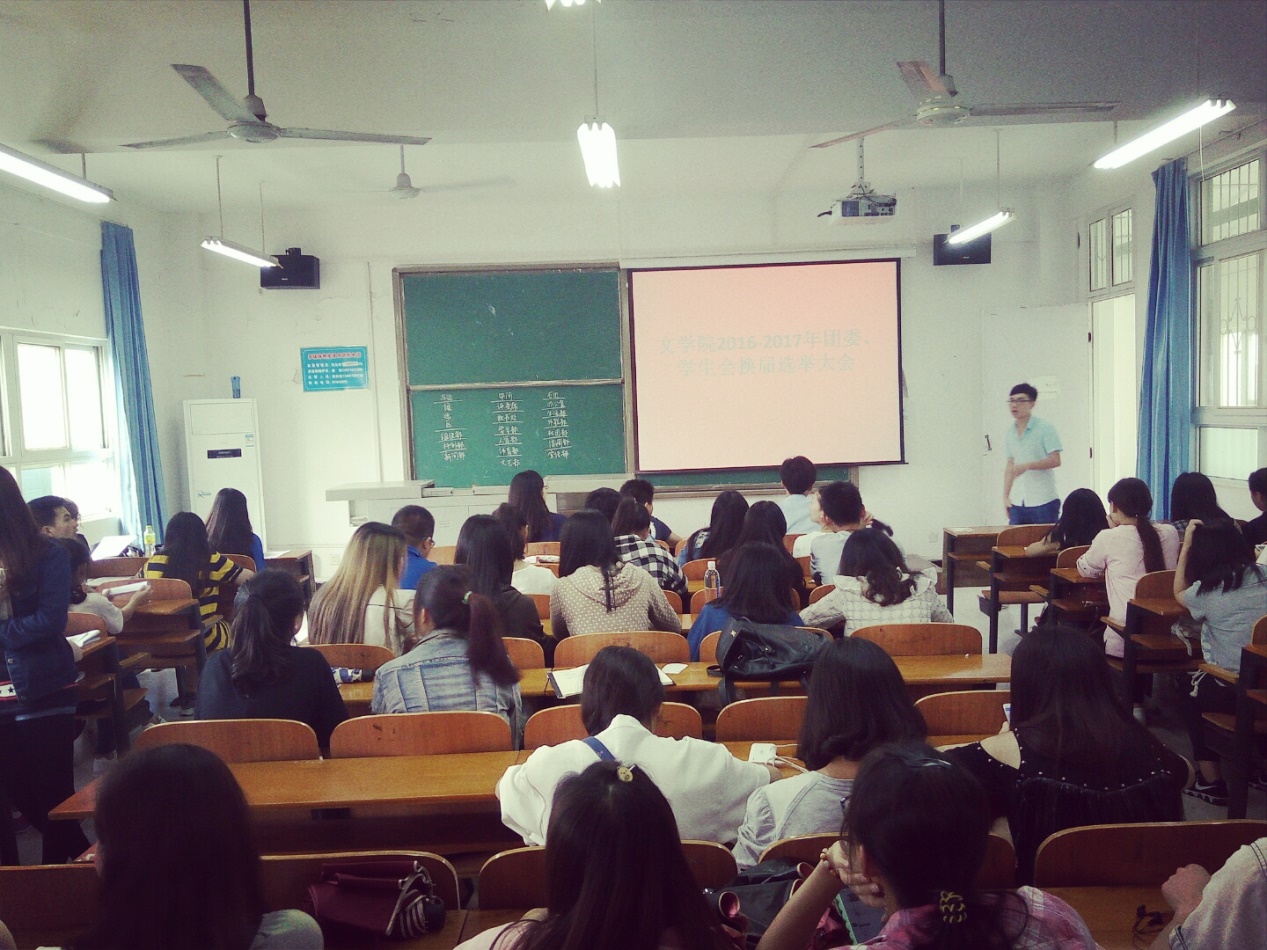 文学院2016-2017年团委学生会换届选举大会2016年6月3日中午12:30在文学院1204教室召开了文学院2016-2017届团委学生会换届大会。候选人选人自我介绍、竞职演说、回答问题等形式展现自身对文学院团委学生会工作建设的意见和构想,充分展示了文学院团委学生会成员锐意进取的精神风貌和认真负责的工作态度。新一届的团委学生会干部将为文学院的学生工作增光添彩。