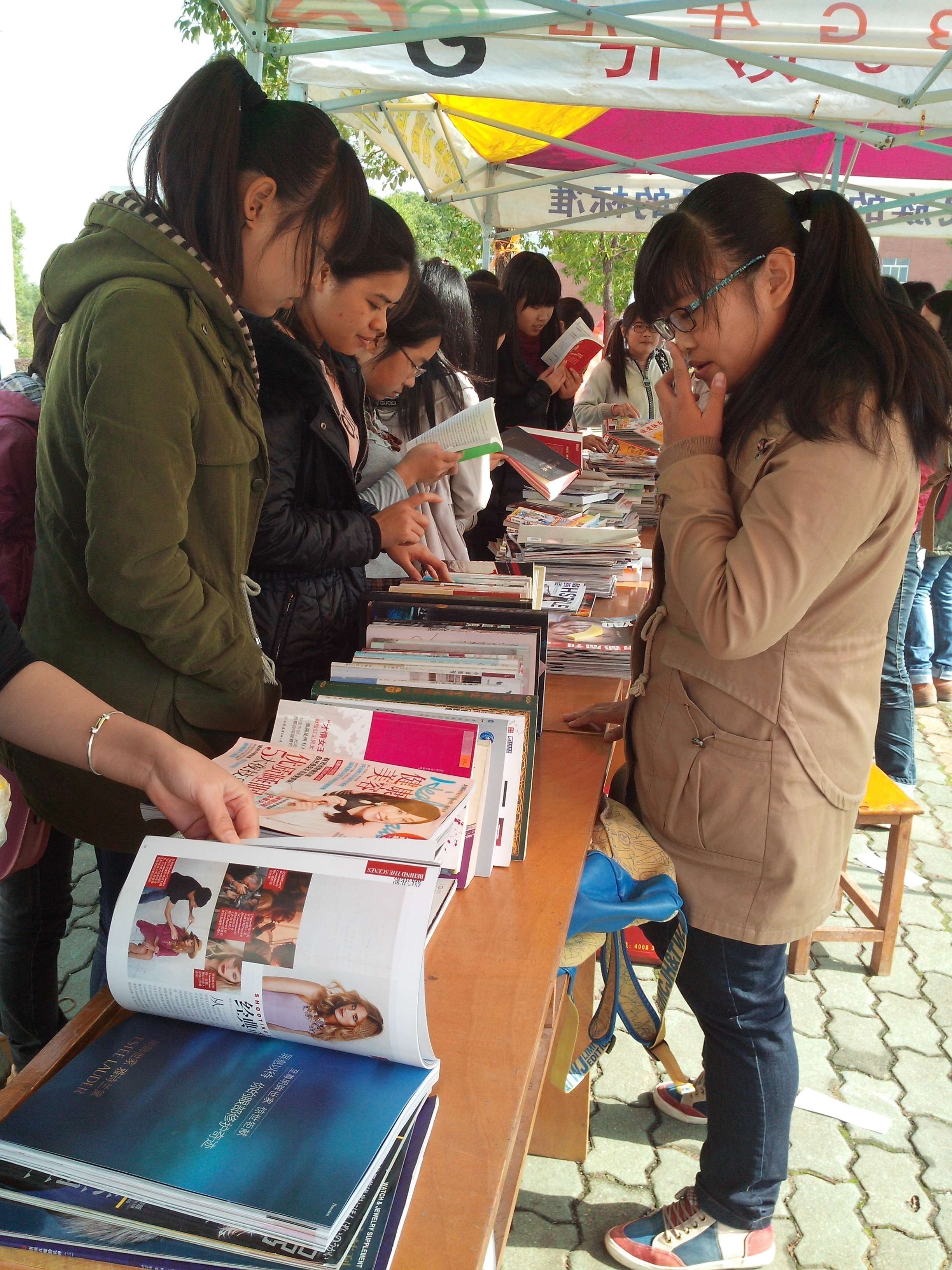 活动开始后,路过的同学就纷纷停下脚步,低下头翻看着桌上陈列的考研、小语种、漫画、小说、等种类的书籍,“这里的辅导书蛮多的哎,买一些肯定帮助很大”同学们谈论道。15级新闻学专业的值班人员杨智妍微笑着向她们介绍“这次活动是很划算的,你们可以仅用原来价格的三分之一买到这些书籍。而且我们的书籍种类很多,你们可以多看一下。”